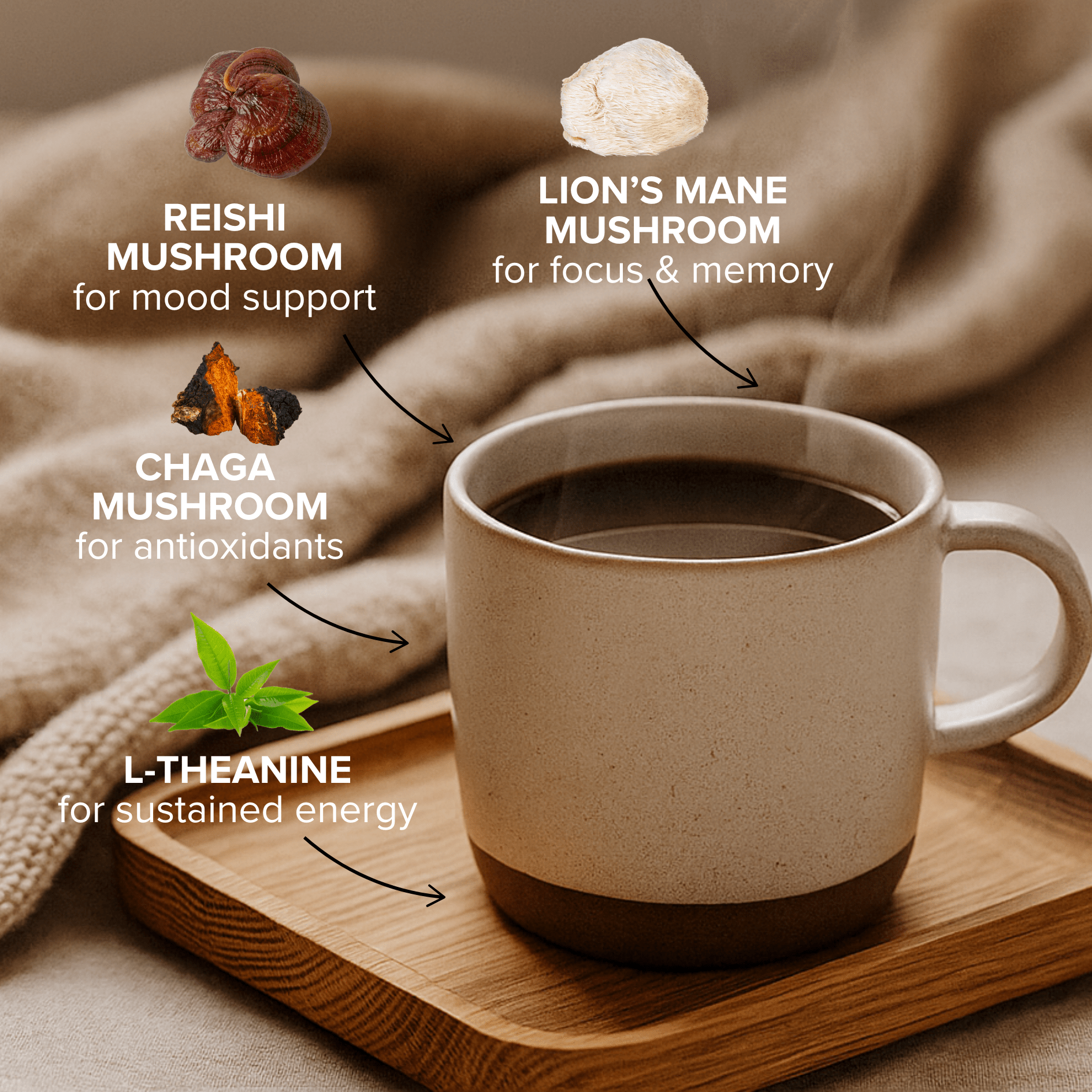 Mushroom coffee blends organic coffee with medicinal mushroom extracts like Lion’s Mane, Reishi, and Chaga. You’ll still get that smooth coffee taste, but with added benefits for focus, energy, and calm - minus the jitters or mid afternoon crash.